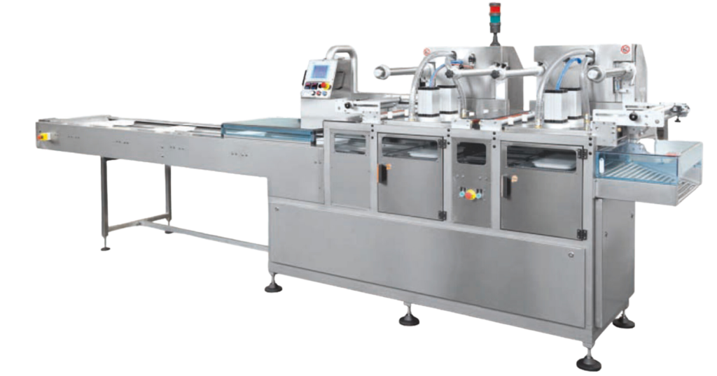 Macchina a doppia testa per la sigillatura e il confezionamento in vuoto o in atmosfera controllata di contenitori preformati di qualsiasi forma.
