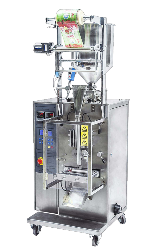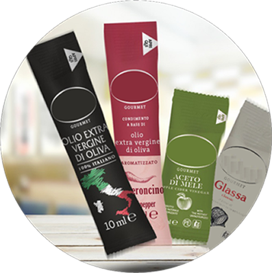 Confezionatrice verticale versatile ed in grado di confezionare prodotti liquidi o fluidi quali olio d’oliva, aceto, miele, ketchup, maionese, shampoo e creme cosmetiche fluide in bustine saldate su 4 lati.